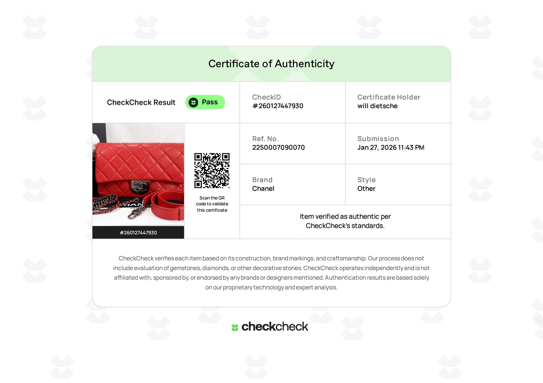 SERIAL NUMBER: 22054278. Includes dust bag, box, and removable straps.
