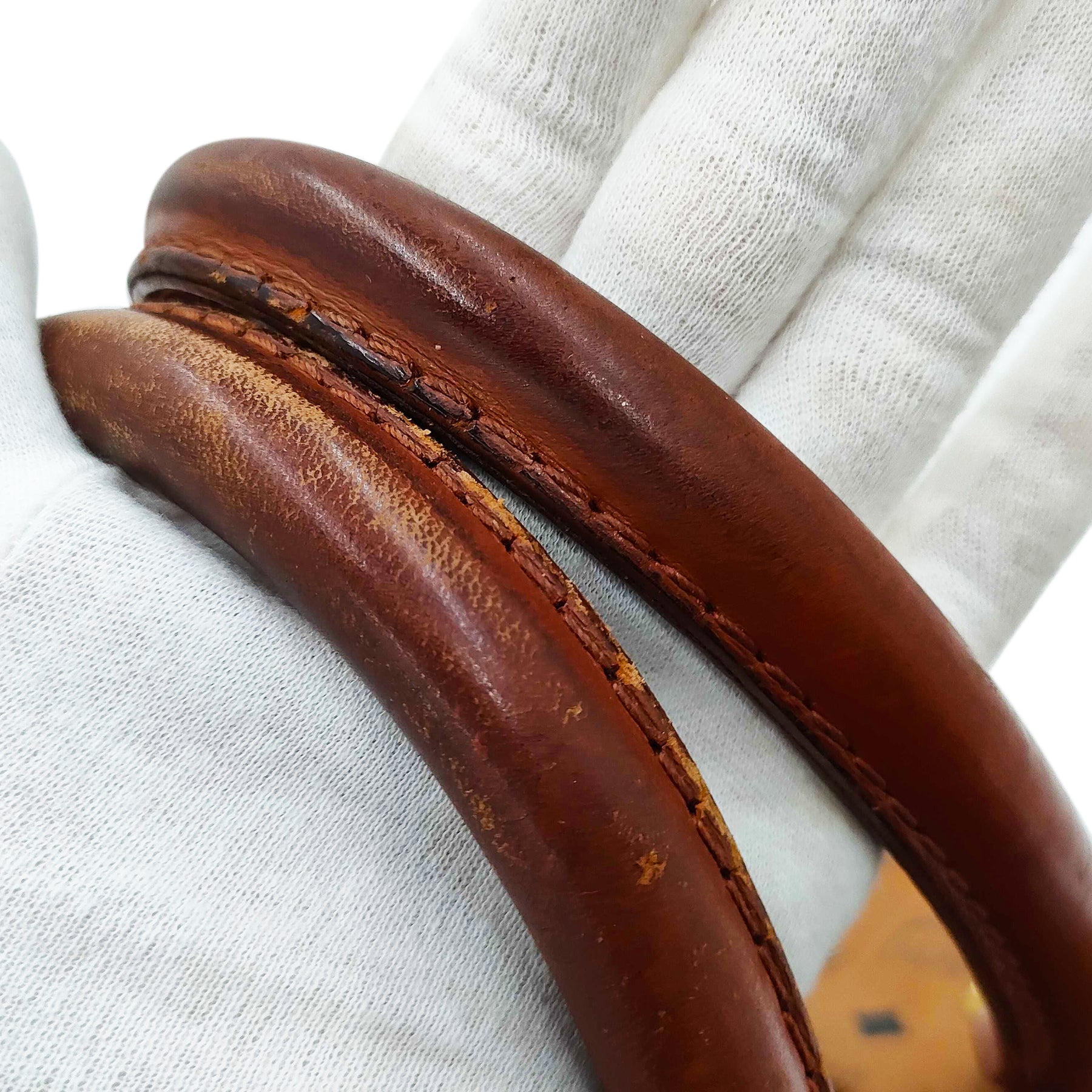 In good condition. Has loss of shape and rubbing on the exterior, wear on the metal fittings and interior. Hardware looks beautiful.